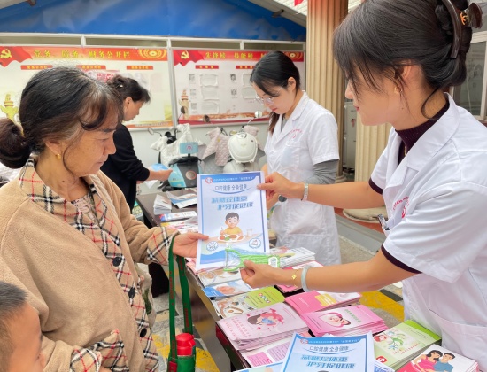 活动现场悬挂“口腔健康 全身健康”宣传横幅,口腔科医护人员为往来群众宣传口腔健康知识,发放宣传彩页200余份,讲解正确刷牙、假牙保养,日常口腔卫生清洁、减糖对维持口腔健康及身体健康好处等知识。同时,为现场群众答疑解惑,提出针对性的口腔保健及治疗建议,引导广大群众养成良好的口腔卫生习惯。