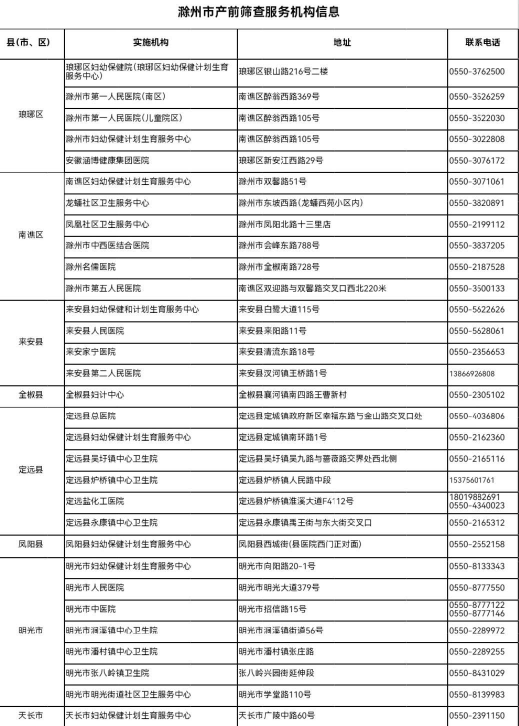 附件:滁州市产前筛查服务机构信息